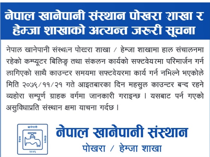 आइतबार नेपाल खानेपानीको पोखरा काउन्टर बन्द रहने सुचना