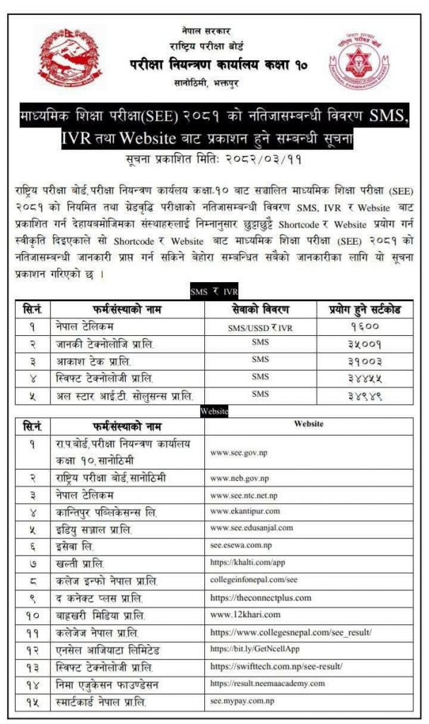 एसईईको नतिजा वेबसाइट, एनटीसीलगायत विविध माध्यमबाट हेर्न सकिने व्यवस्था मिलाइएको छ ।