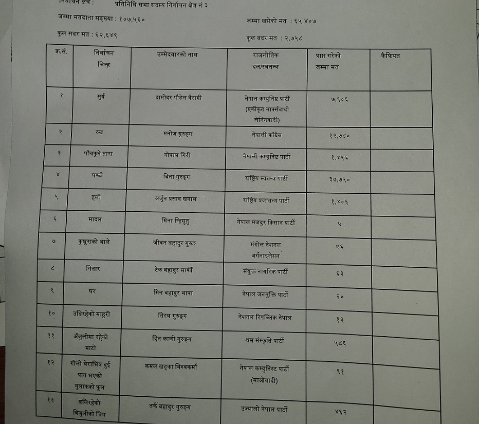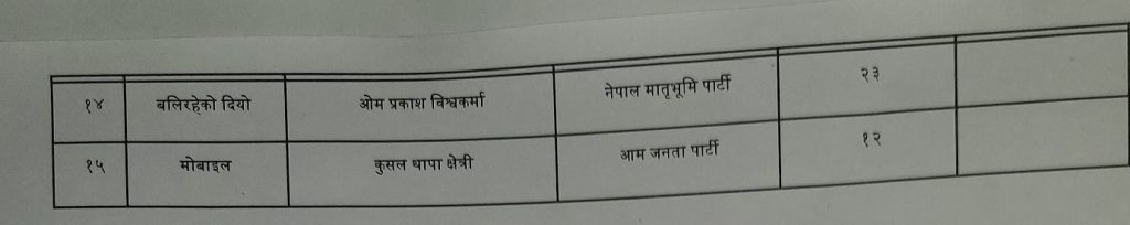 तेस्रो स्थानमा रहेका नेकपा एमालेका उम्मेदवार दमोदर बैरागीले ७ हजार ९ सय ६ मत ल्याएका छन् भने नेपाली कम्युनिष्ट पार्टीका गोपाल गिरीले १ हजार ४ सय ५६ मत ल्याएका छन् । राप्रपाका अर्जुन खनालले १ हजार ४ सय ६ मत ल्याए ।