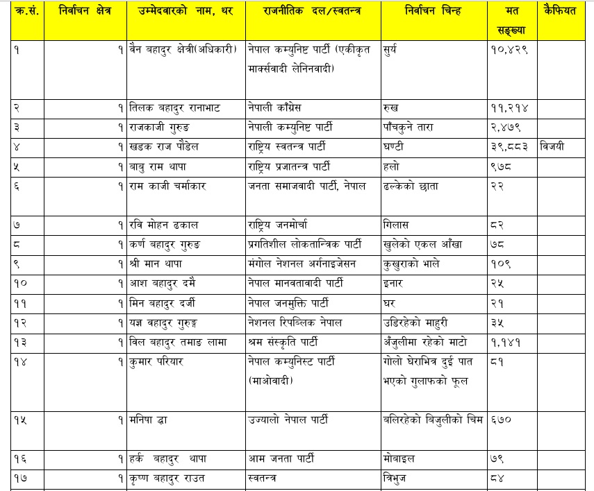पौडेलले ३९ हजार ८ सय ८३ मत प्राप्त प्राप्त गर्दा रानाभाटले ११ हजार २ सय १४ मत प्राप्त गरे । त्यसै गरी नेकपा एमालेका बैन बहादुर अधिकारी क्षेत्रीले तेस्रो हुँदै १० हजार ४ सय २९ मत प्राप्त गरे । नेपाली कम्युनिष्ट पार्टीका राजकाजी गुरुङले २ हजार ४ सय ७९ मत ल्याएका छन् ।
